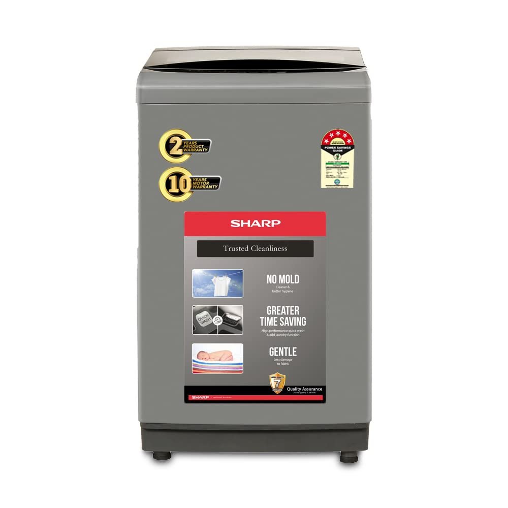 SHARP 7.5 kg Fully Automatic Top Load Washing Machine with Toughened Glass I JAPAN QUALITY I Hot & Cold Water Dual Inlet, Soft Close, Add Laundry I 10 Wash Mode I SS Pulsator I ES-T75N-GY I Inox Grey