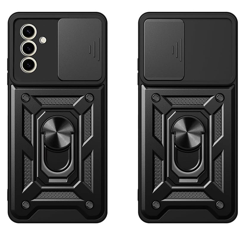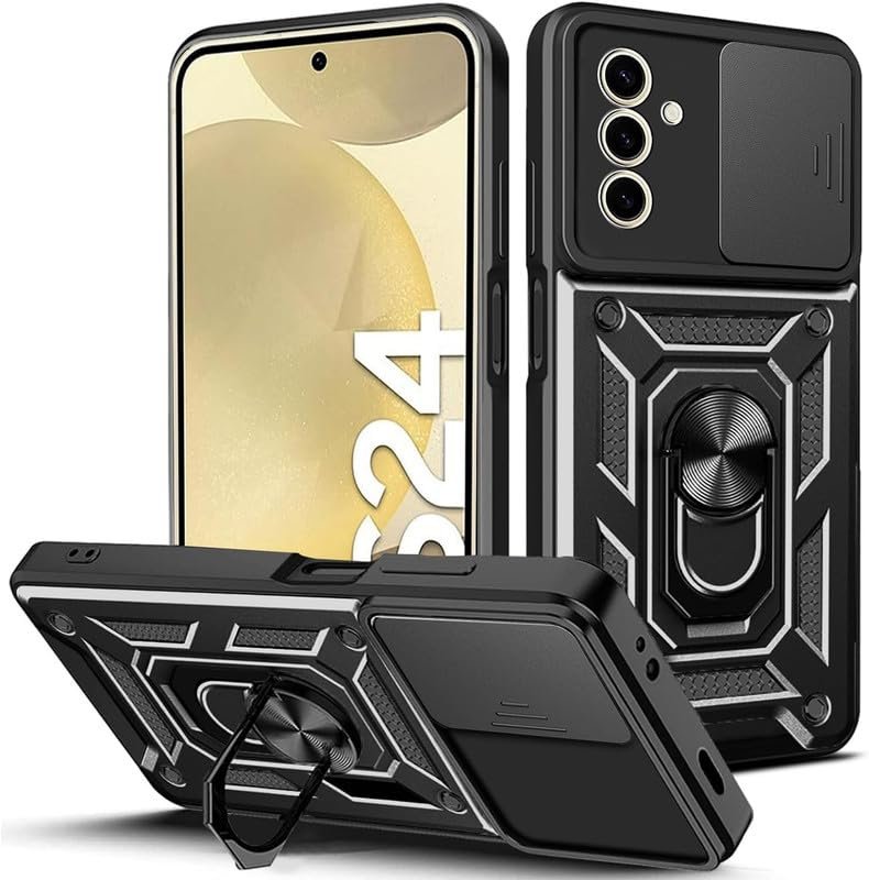 SkyTree Samsung Galaxy S24 5G, Robotic Sliding Camera Window Shock Proof Thunder Case, Dual Layer Hybrid Armor Back Cover Case with Kickstand for Samsung Galaxy S24 5G – Black