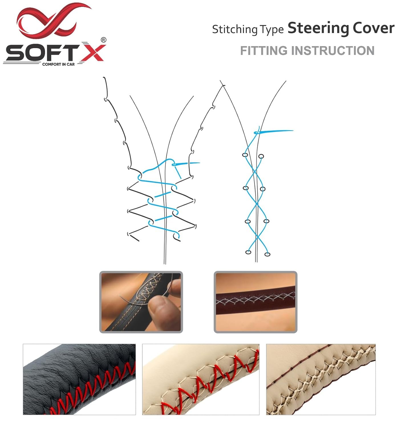Upgrade your Car’s driving experience with the SOFT X Premium Stitching Type Steering Wheel Cover. Made from premium faux leather, it offers the perfect balance of luxury, comfort, and durability. The breathable and anti-slip design ensures a secure grip, making every drive safer and more comfortable. Its DIY sewable feature allows you to create a snug, handmade fit using the included sewing needle and two premium threads—one matching and one contrast—for a stylish, personalized finish. Not only does this steering wheel cover protect your wheel from wear, scratches, and sunlight, but it also enhances the interior look of your Car with a premium touch.