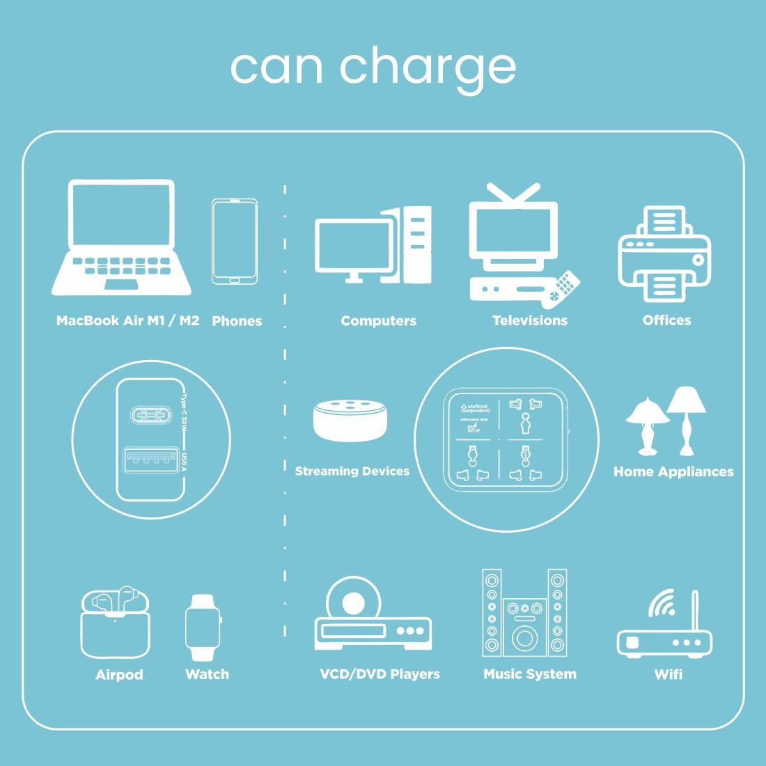 [Charge 5 Devices At the Same time]:The ChargeCube30 features 3 AC Mains plugs to charge any device of your choice along with a type C and type A port. The Type C + Type A ports provide a max output of 30W supporting PD and PPS fast charging protocols. The ChargeCube30 is powerful enough to accommodate most appliances such as Monitors, printers, scanners, lamps. Please Note: Do not attach highpowered appliances (10/16A) such as Refrigerators, ACs.