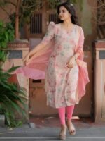 Sun Fashion and Lifestle Presents Chanderi Floral Printed Straight Puff Sleeve Kurta.Silk jacuard butti Printed Dupatta