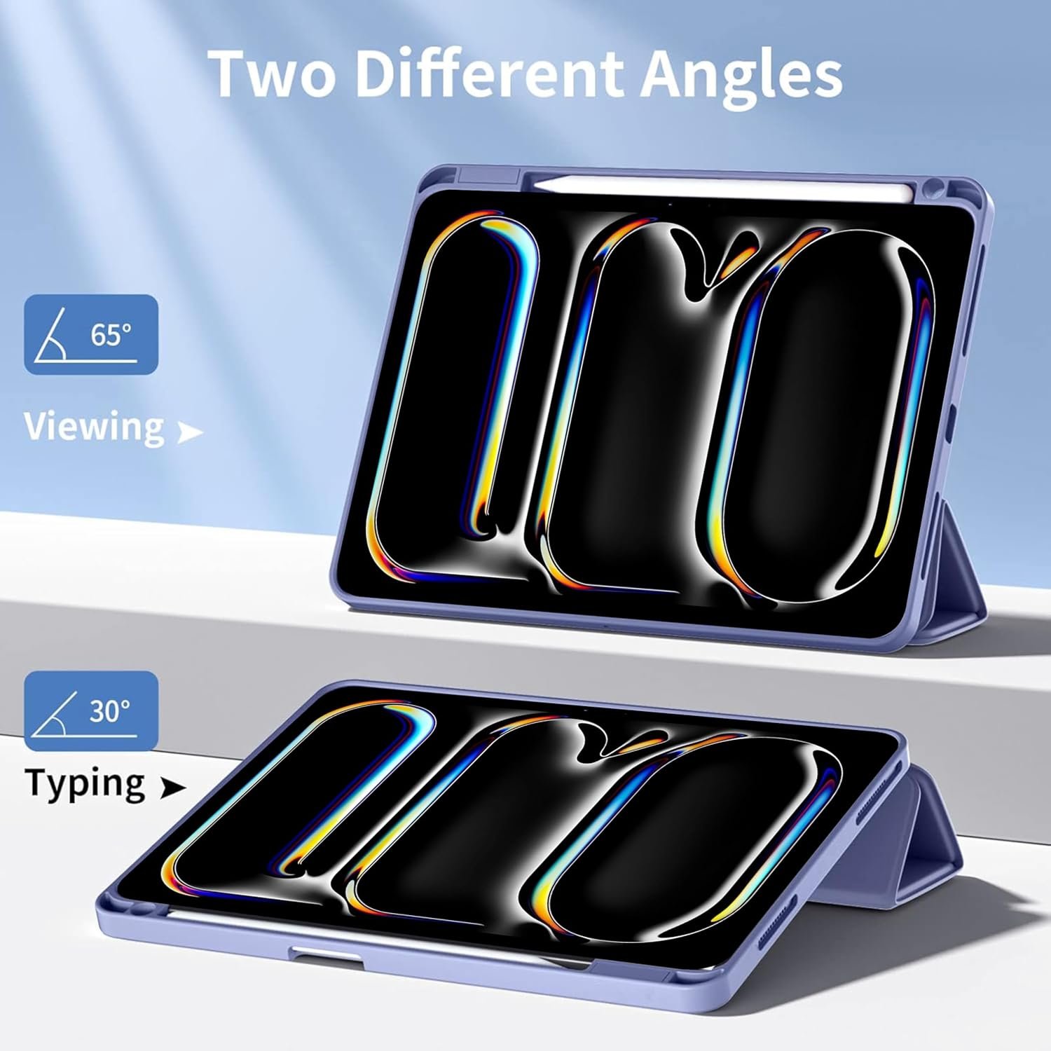 360 Degree Rotating Tri-Fold Stand: The case coming with a 360 degree swivel Tri-Fold design, stably supports youriPad Pro 11 2024 M4 5th Gen whether in a portrait, landscape, Tri-Fold stand mode in various angles with anti-slip deep grooves. Functional & convenient.