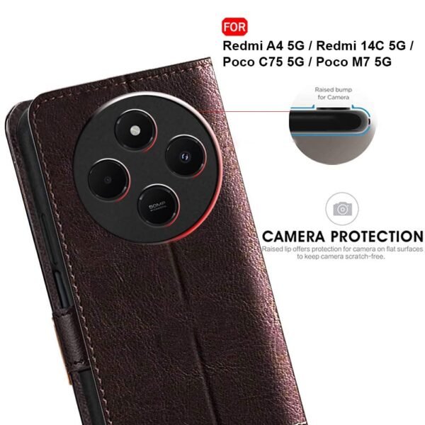 TheGiftKart Flip Back Cover Case for Mi Redmi A4 5G / Redmi 14C 5G / Poco C75 5G / Poco M7 5G | Dual-Color Leather Finish | Inbuilt Stand & Pockets | Flip Back Cover (Faux Leather, Coffee & Brown)