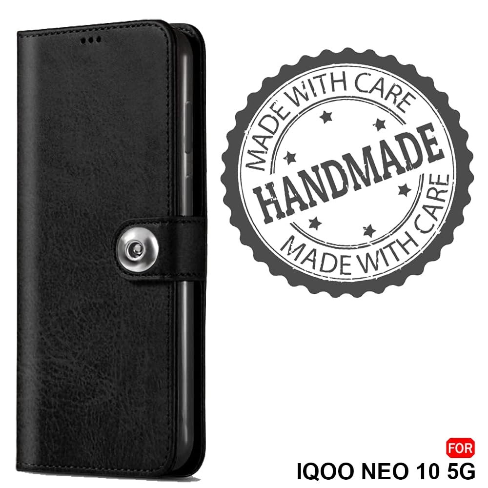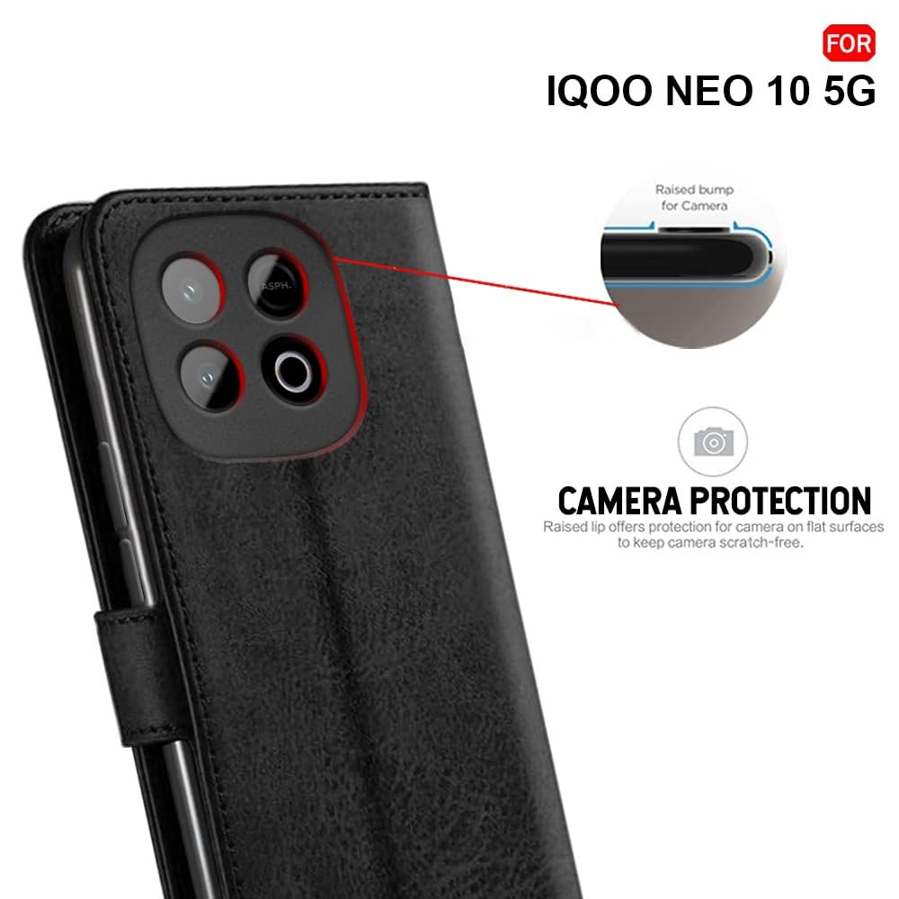 TheGiftKart Flip Cover Back Case for iQOO Neo 10 5G | Genuine Leather Finish | Designer Button | Inbuilt Pockets & Stand | Flip Back Cover Case for iQOO Neo 10 5G (Faux Leather, Black)