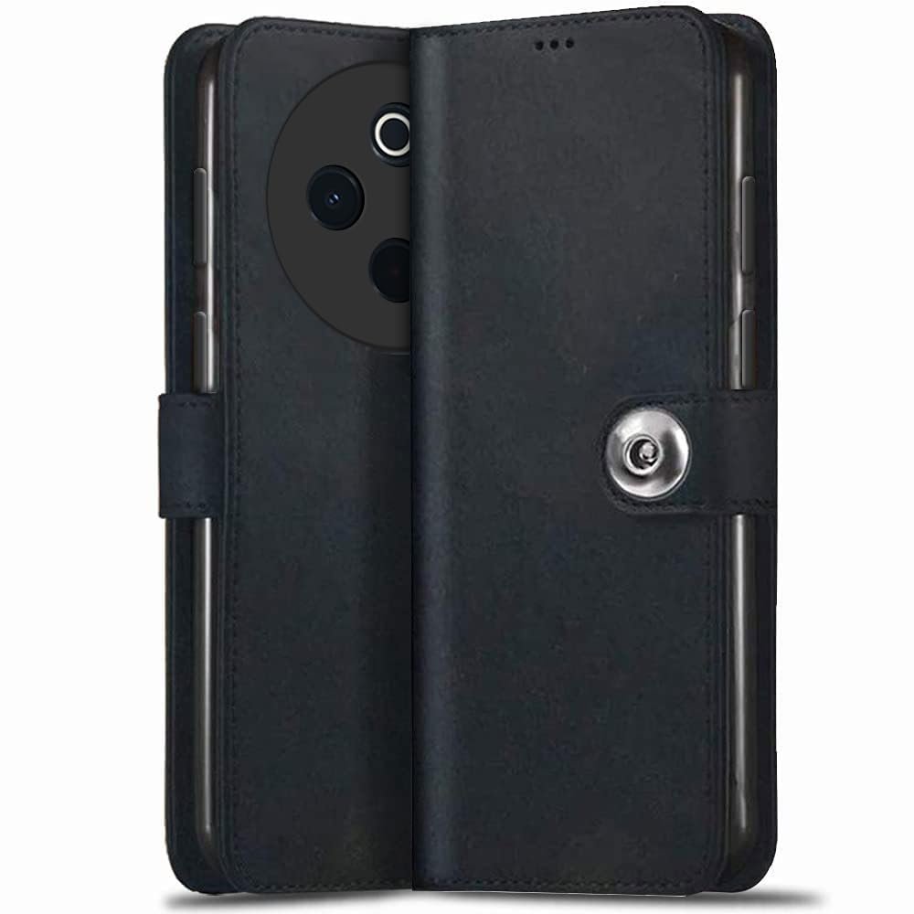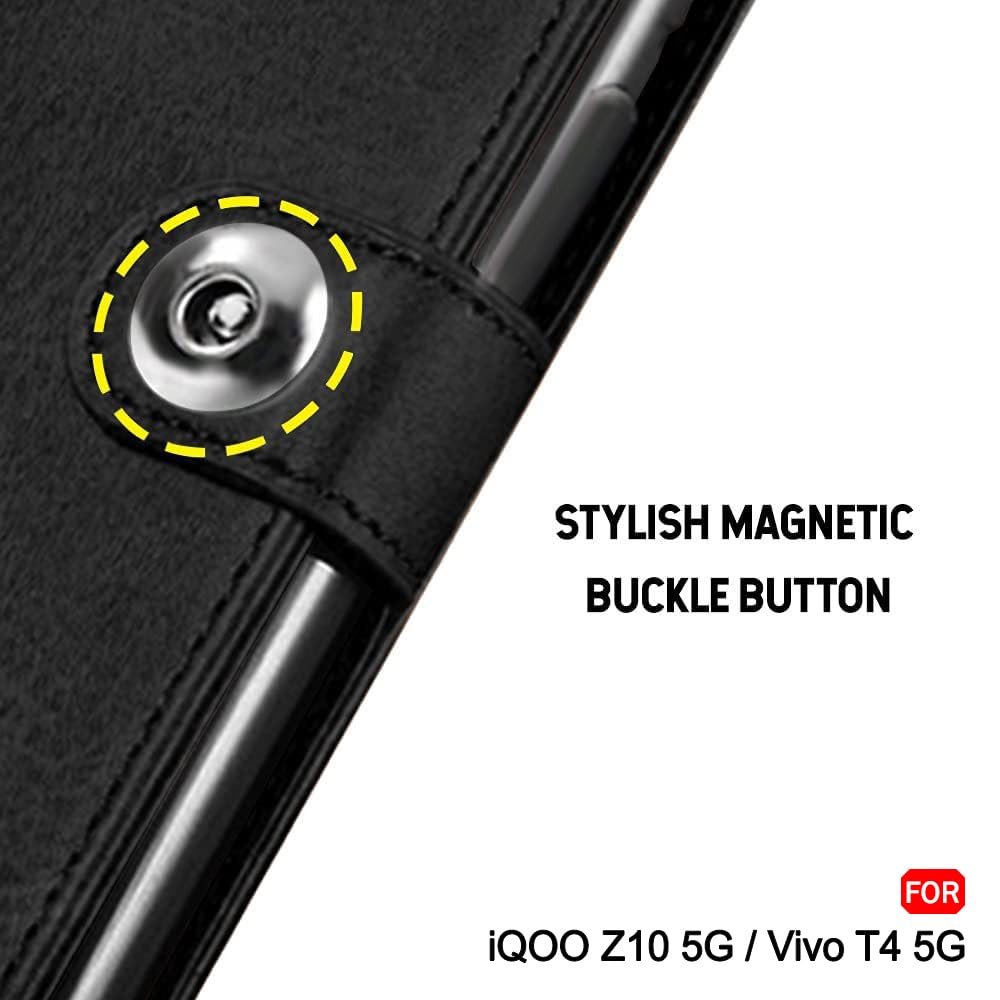 TheGiftKart Flip Cover Back Case for iQOO Z10 5G / Vivo T4 5G | Genuine Leather Finish | Designer Button | Inbuilt Pockets & Stand | Flip Back Cover for iQOO Z10 5G / Vivo T4 5G (Faux Leather, Black)