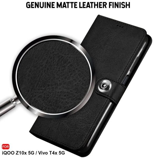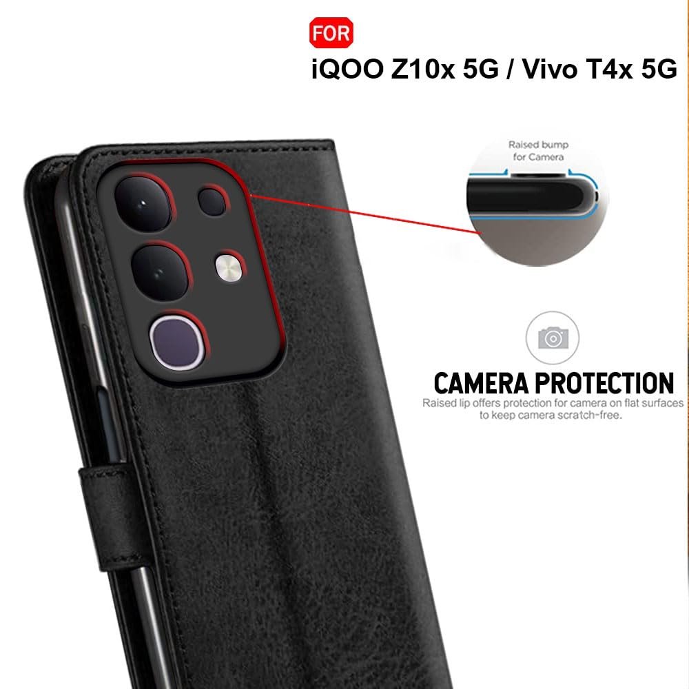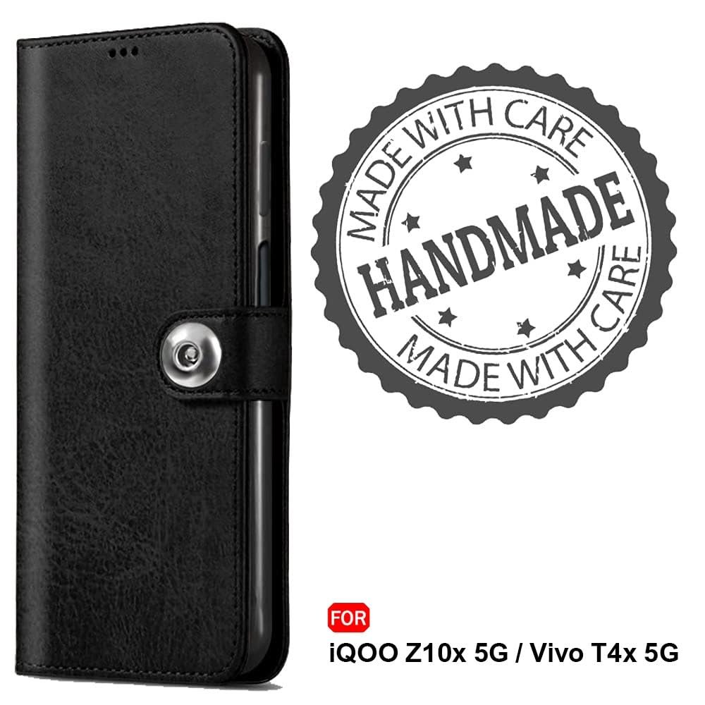 TheGiftKart Flip Cover Back Case for iQOO Z10x 5G / Vivo T4x 5G | Genuine Leather Finish | Designer Button | Inbuilt Pockets & Stand | Flip Cover for iQOO Z10x 5G / Vivo T4x 5G (Faux Leather, Black)