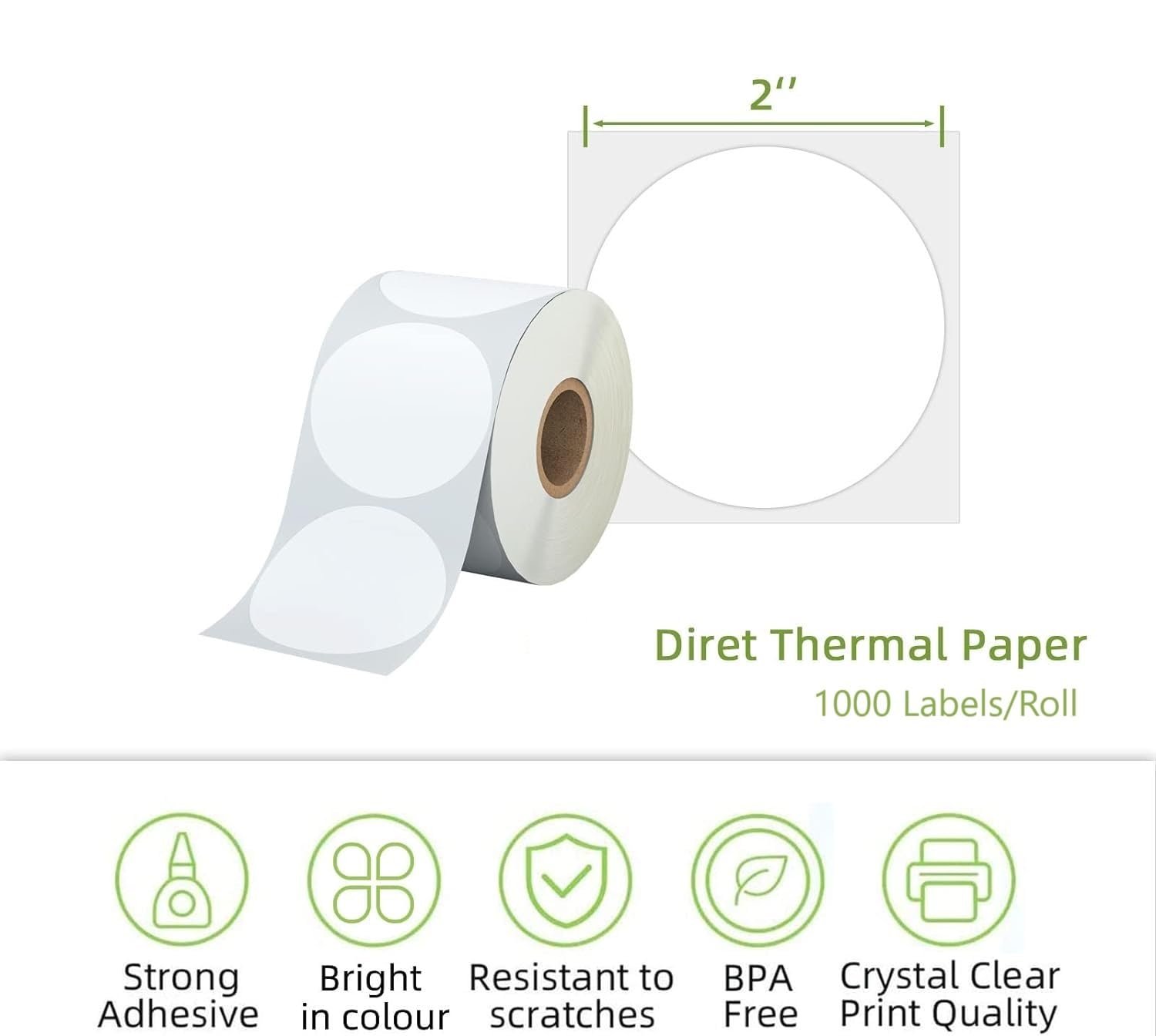 SPECIFICATION: 2″ x 2 ” (50mm x 50mm) Circle White Label. 750 Labels/Roll, 1 Roll. No Ink Toner or Ribbons Needed!