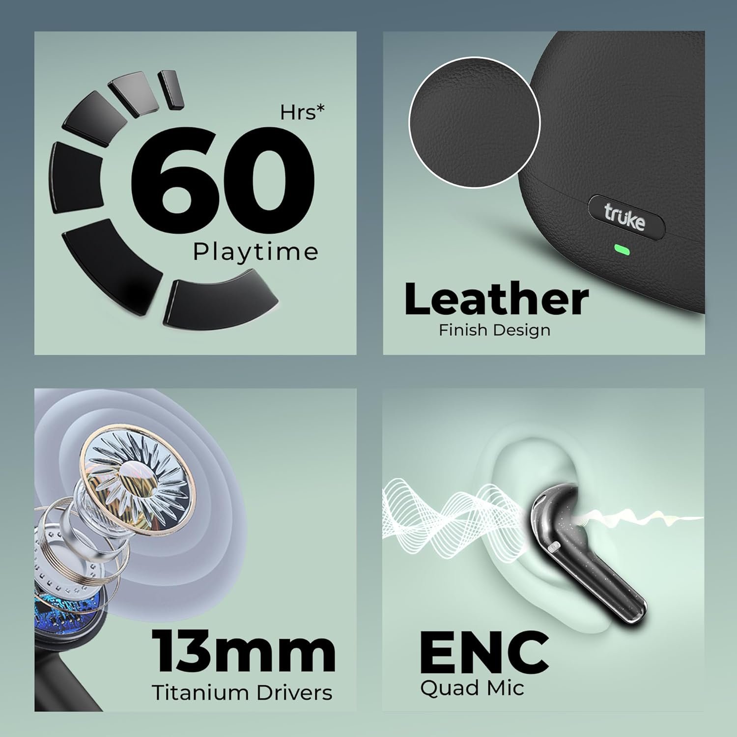 truke New Launch Aura Pro True Wireless in Ear Earbuds w/ 60H Battery & Fast Charge Ear Buds, 13mm Titanium Drivers, Dual Pairing, 4-Mic ENC TWS, 40ms Low Latency Gaming, Made in India -MidnightBlack