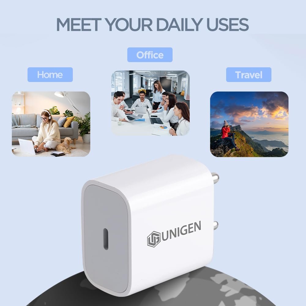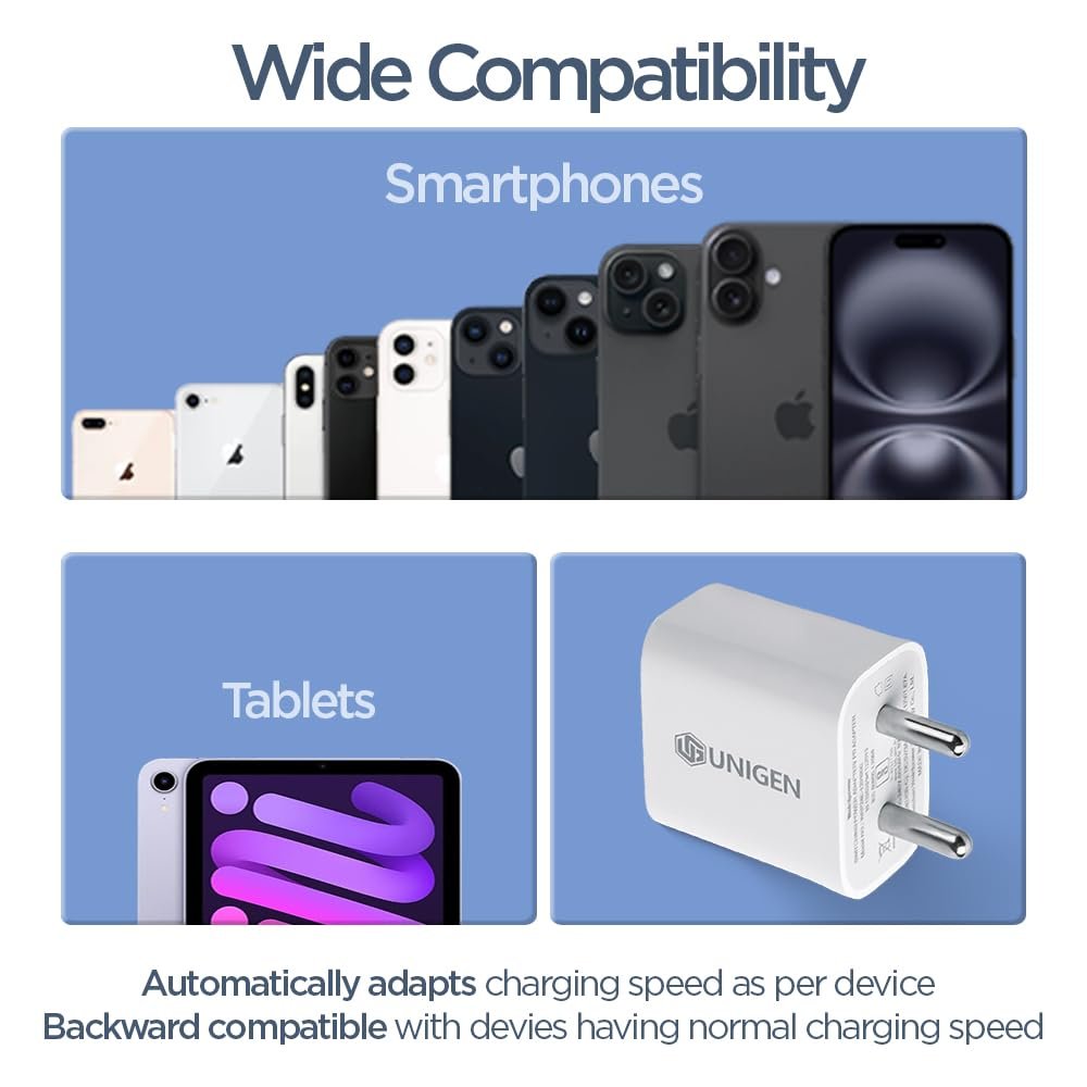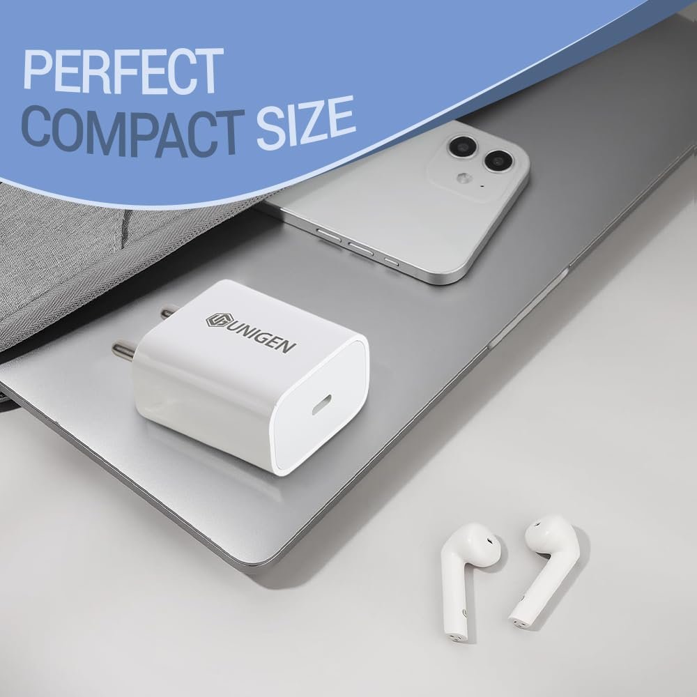 UNIGEN® 20W Type-C PD 3.0 Original Fast Charger – BIS Certified Adapter Compatible with iPhone 16 Pro Max/16 Pro/16 Plus/16/15/14/13/12/11/SE/XS, iPad, iWatch & All Android Devices – White