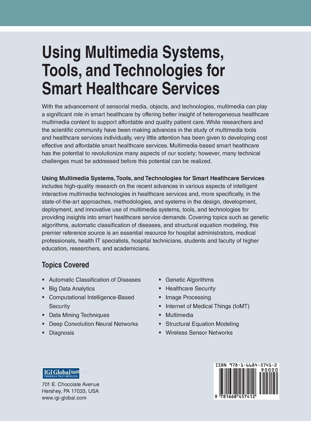 Using Multimedia Systems, Tools, and Technologies for Smart Healthcare Services includes high-quality research on the recent advances in various aspects of intelligent interactive multimedia technologies in healthcare services and, more specifically, in the state-of-the-art approaches, methodologies, and systems in the design, development, deployment, and innovative use of multimedia systems, tools, and technologies for providing insights into smart healthcare service demands. Covering topics such as genetic algorithms, automatic classification of diseases, and structural equation modeling, this premier reference source is an essential resource for hospital administrators, medical professionals, health IT specialists, hospital technicians, students and faculty of higher education, researchers, and academicians.