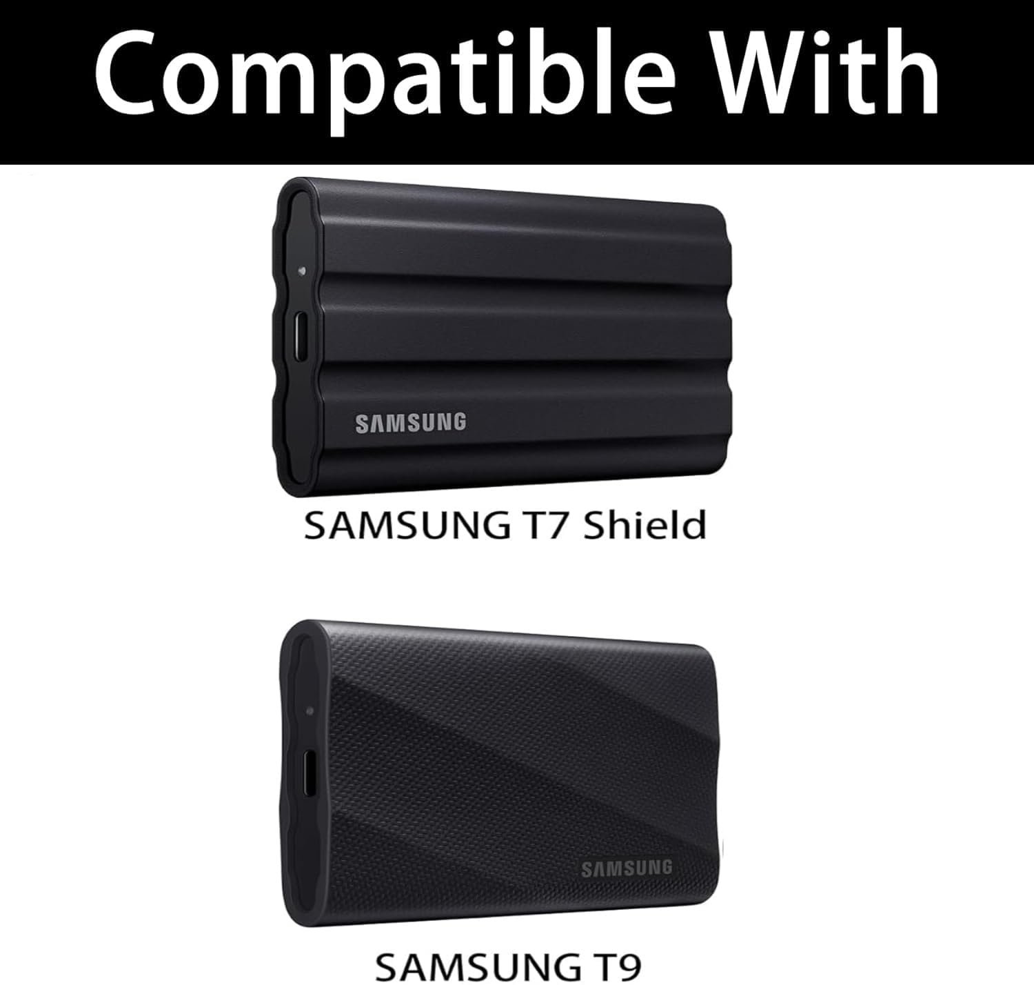 External SSD Case for Samsung T9 / T7 Shield : Portable hard drive case made of EVA materials-shockproof, scratch proof, water-resistant and comfortable pu leather finishing. Protect for Samsung ssd against damage, keep ssd brand new and prolong the life of the ssd.