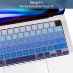Compatible with–U.S keyboard layout ONLY: Latest MacBook Air 15″ M2 2023 A2941, 13.6″ A2681 /MacBook Pro 14.2″ 2021-22 (A2442), 2023 (A2779) MacBook Pro 16″ 2021-22 (A2485), 2023(2780) M1/M2 Pro | Max ATTENTION!! THIS KEYBOARD COVER DOES NOT FIT FOR: 2021-2020 Macbook Air 13.3 inch with M1 Chip and 2020-2013 MacBook Air 13 inch No interference for Touch ID accessing to laptop 0.26 MM/0.01 IN THICKNESS: this cover is made of engineering grade silicon material. Extra slim TPU skin, made it easier for typing Every key is specially molded, manufactured to the quality available. Flexible and reusable, this cover is easy to apply and remove for cleaning Waterproof, dust-proof and dirt-proof design can prevent liquid, dust, cigarette ash, biscuit crumbs falling onto your keyboard to affect your keyboard’s life Easy access to keys through clear keyboard cover. Backlight is easy to shine through the high transparent keyboard cover