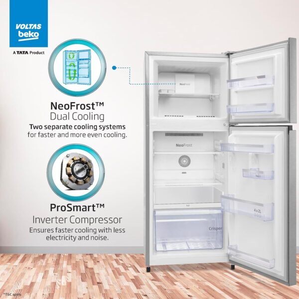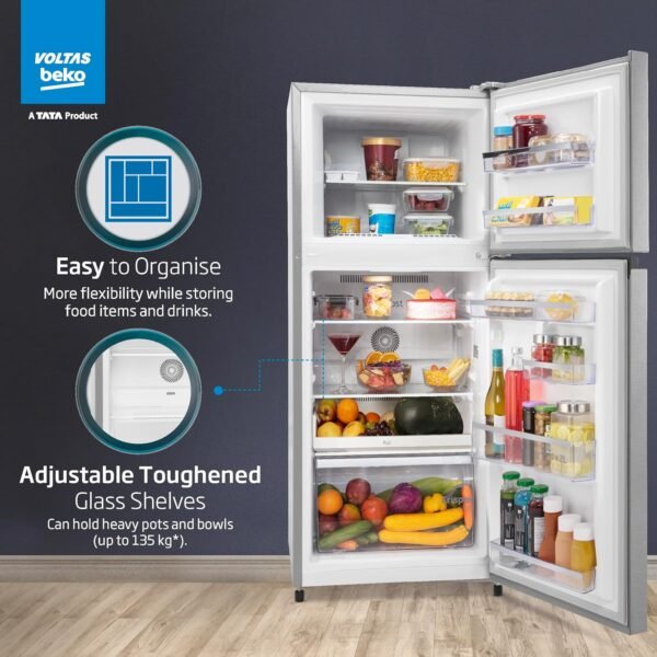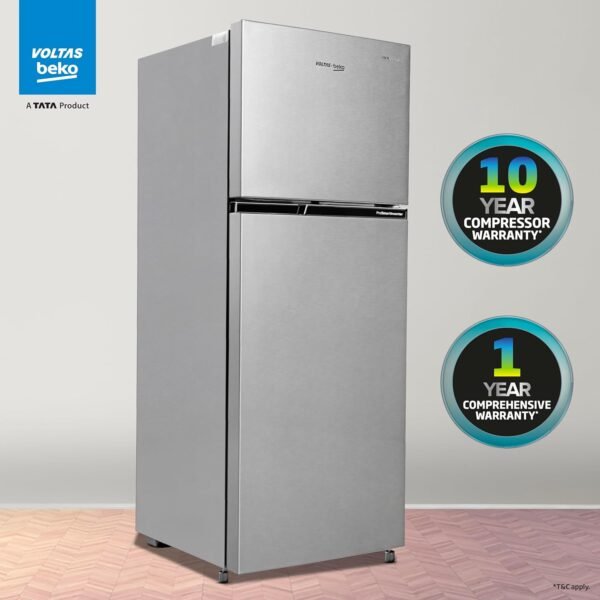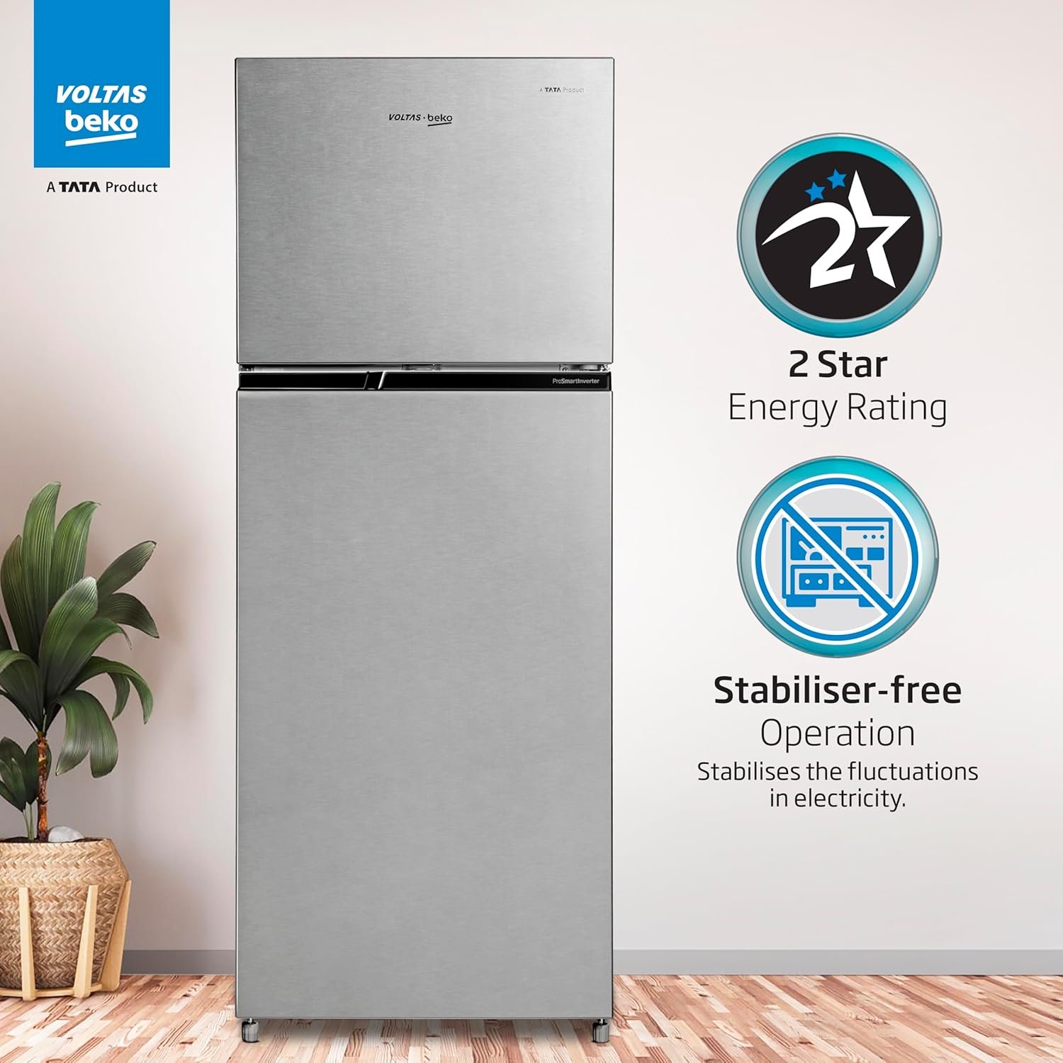 Voltas Beko, A Tata Product 243 L, 2 Star, 6-in-1 Adjustable Frost Free Inverter Double Door Refrigerator (2025 Model, RFF280D / WPXIR0I0000GO, Brushed Silver)