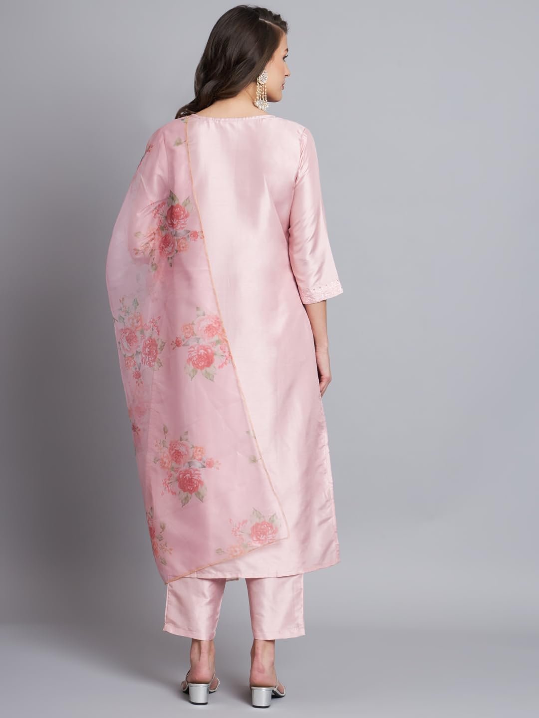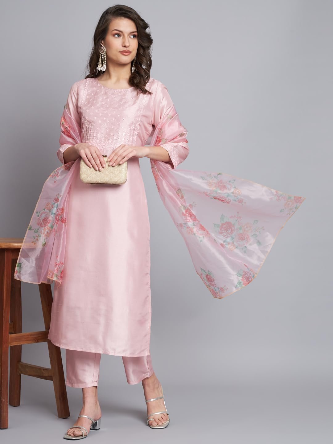 VredeVogel Women’s Silk Blend Embroidered Straight Kurta Pant Set with Organza Dupatta