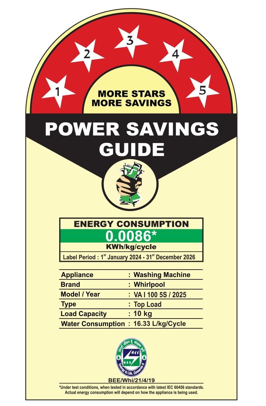 Energy Rating 5 Star: Best in class efficiency | Energy consumption – 0.0086* KWh/kg/cycle (Please refer BEE label for more information), Model/Year : VA I 100 5S/2025