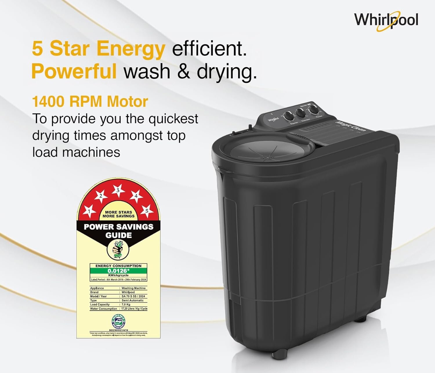 Whirlpool 7.0 Kg 5 Star MAGIC CLEAN Semi-Automatic Top Loading Washing Machine (MAGIC CLEAN RYL SRS 7.0 GREY DAZZLE (5YR), 4 Year Comprehensive Warranty, 1400 RPM Motor, 5 Year Motor Warranty)