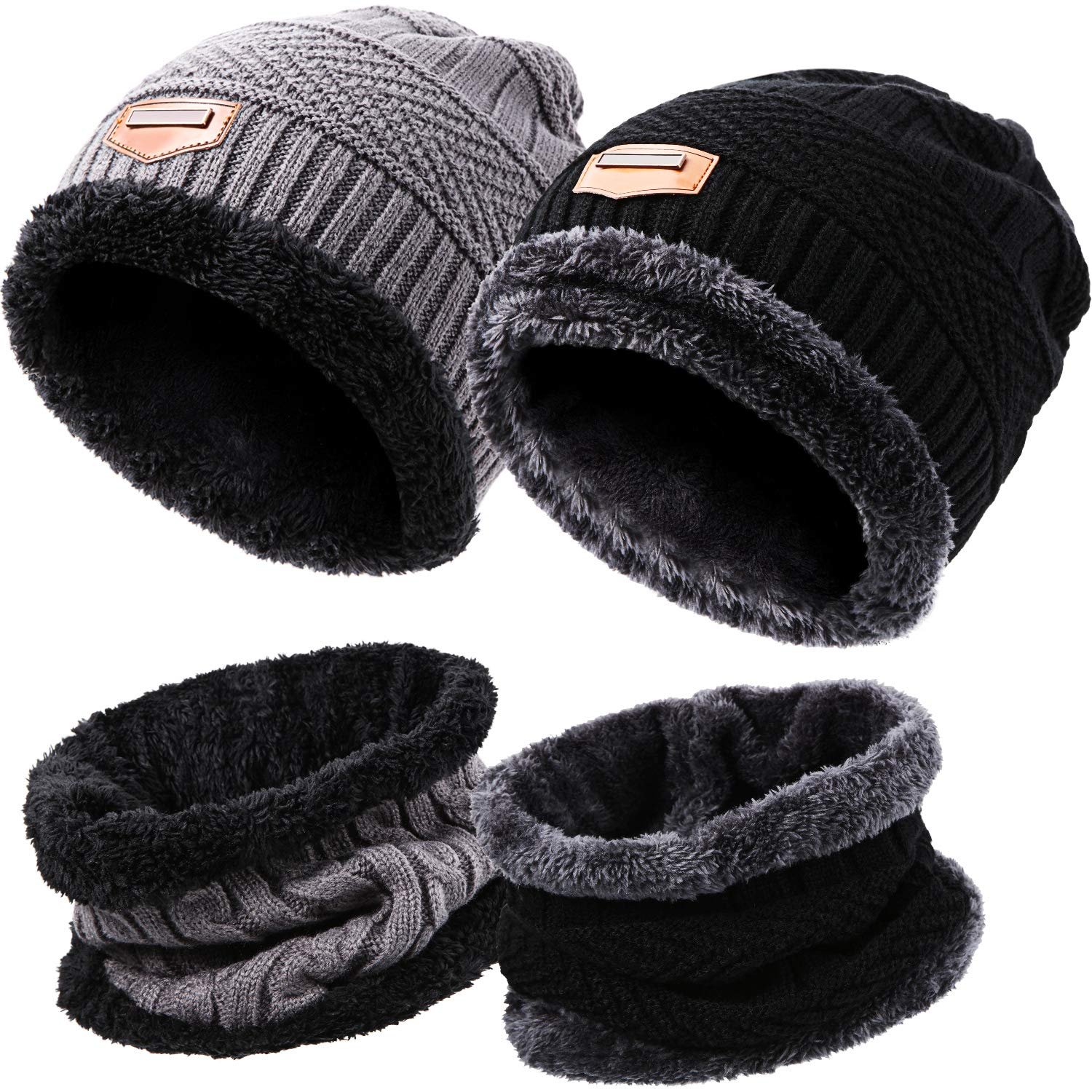 Winter Beanie Hat Scarf Set Fleece Lined Skull Cap and Scarf Unisex, 4 Pieces (Black and Grey)