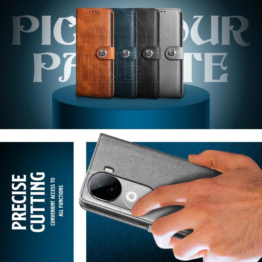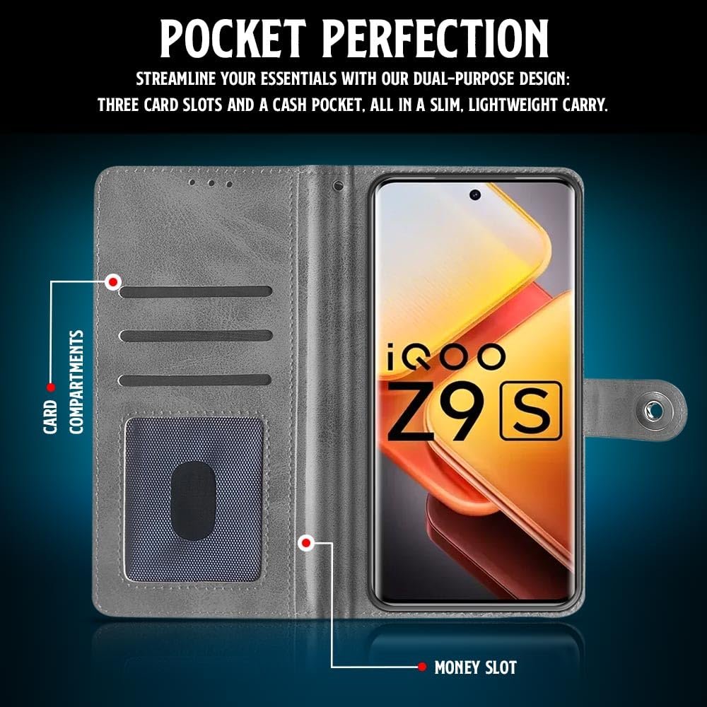 WOW IMAGINE Shock Proof Flip Cover Back Case for iQOO Z9s 5G | Vivo V40e 5G (Magnetic Button Flip Case | Wallet Pockets & Stand | Leather Finish | Stone Grey)
