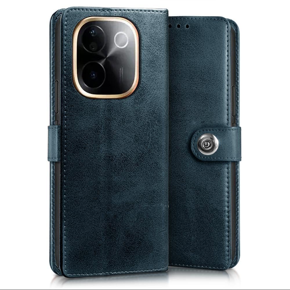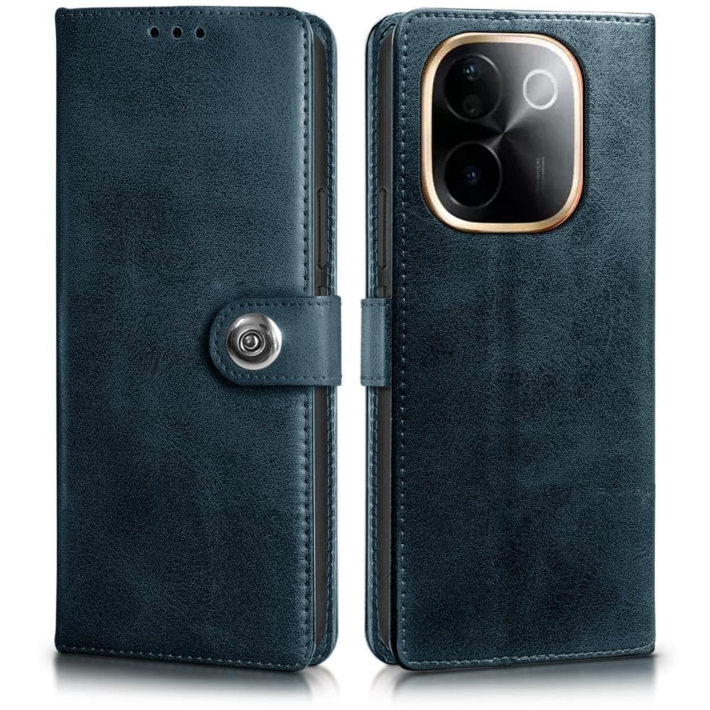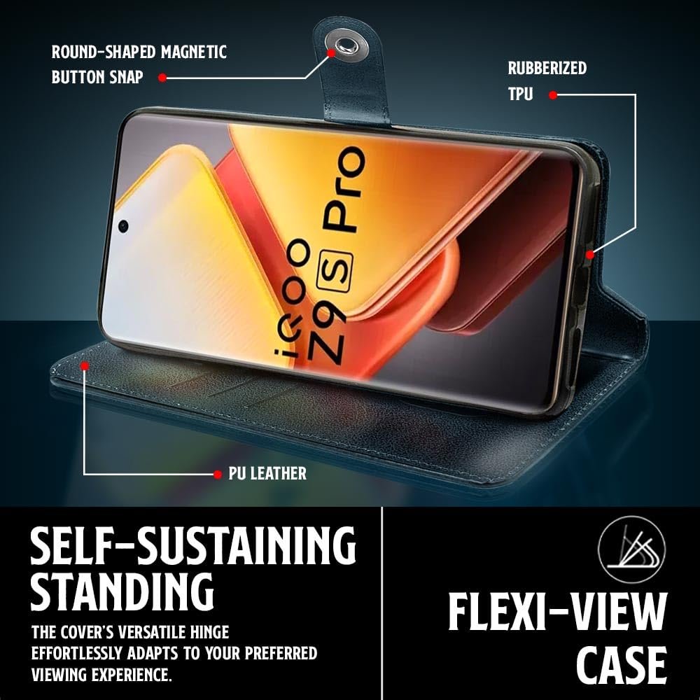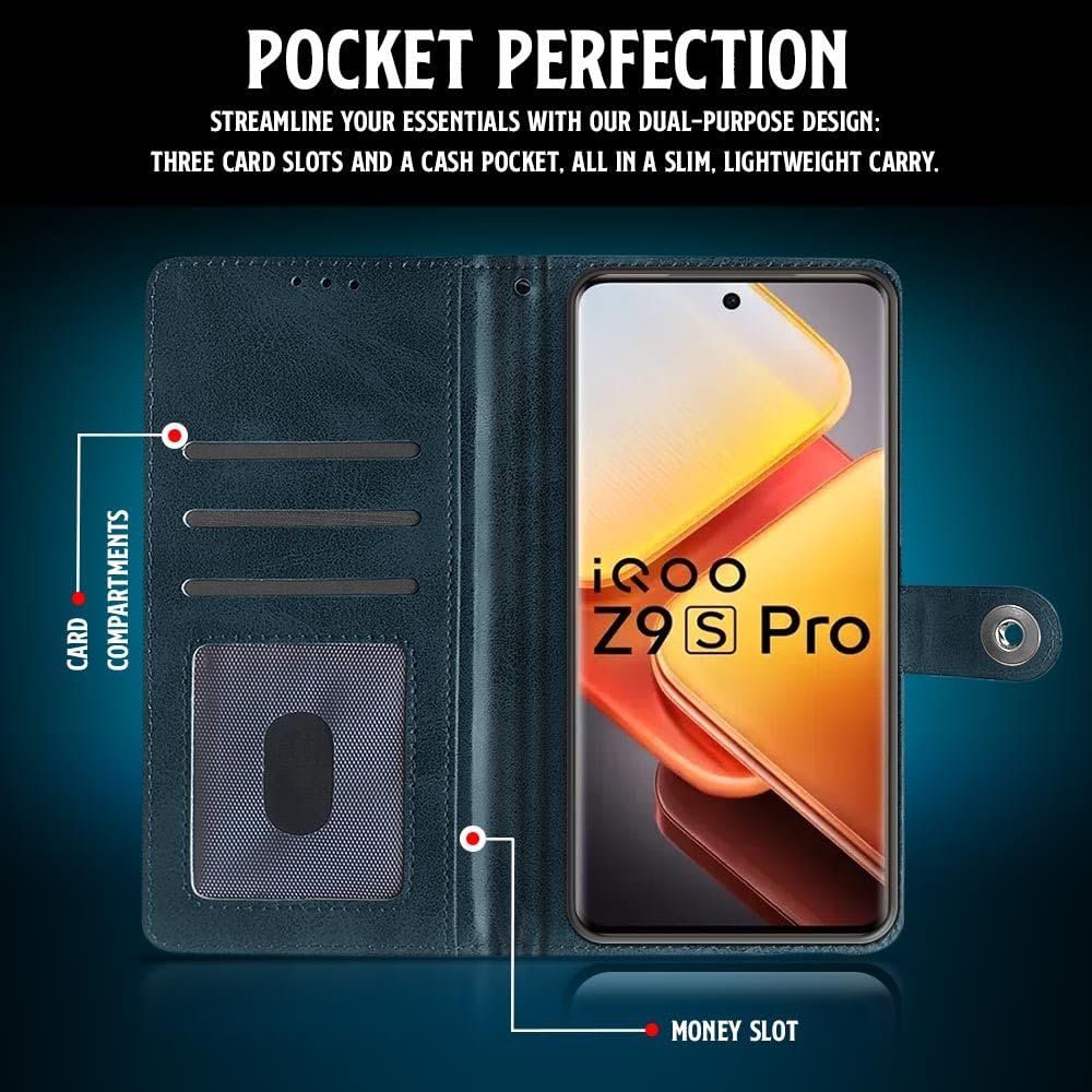 WOW IMAGINE Shock Proof Flip Cover Back Case for iQOO Z9s Pro 5G | Vivo T3 Pro 5G (Magnetic Button Flip Case | Wallet Pockets & Stand | Leather Finish | Oxford Blue)