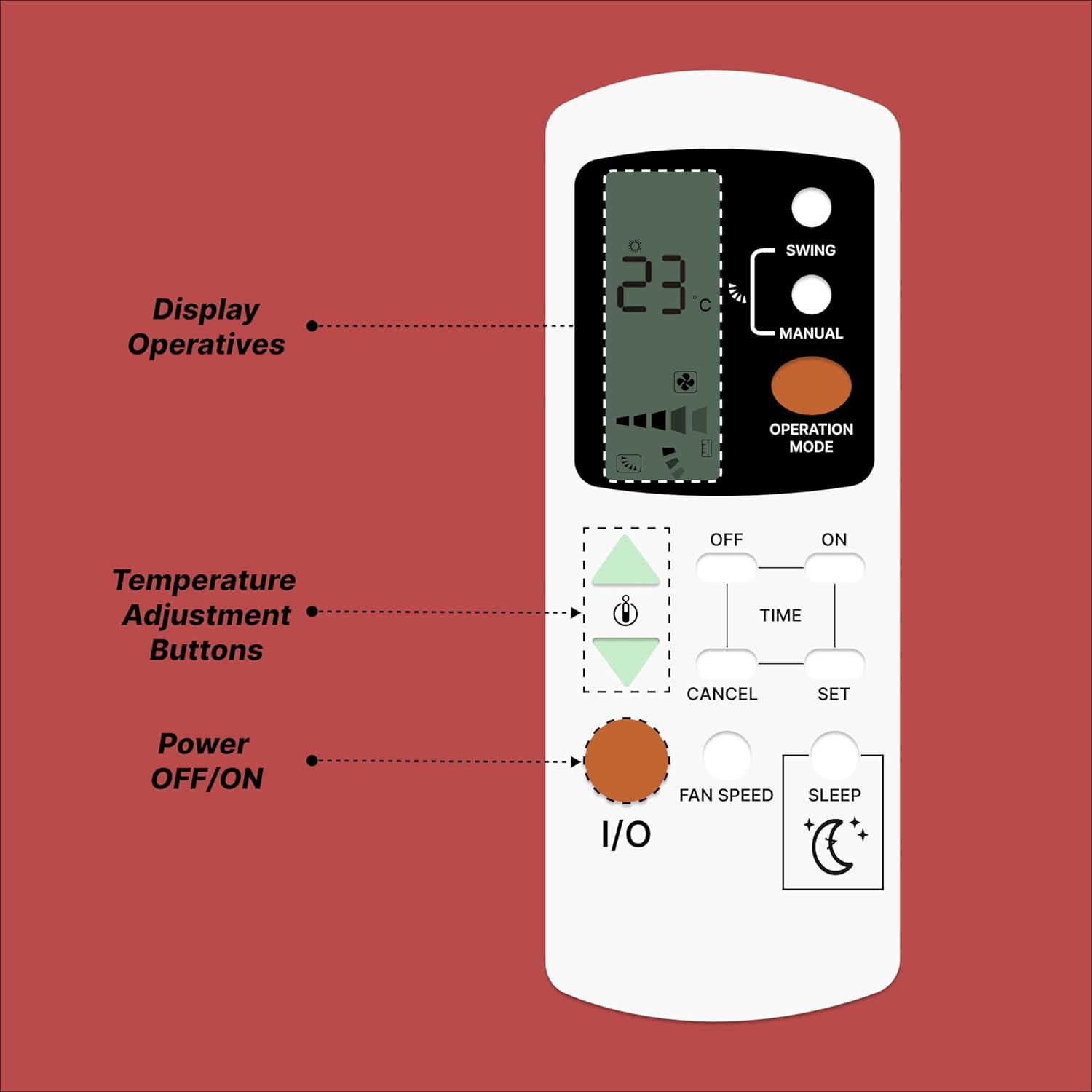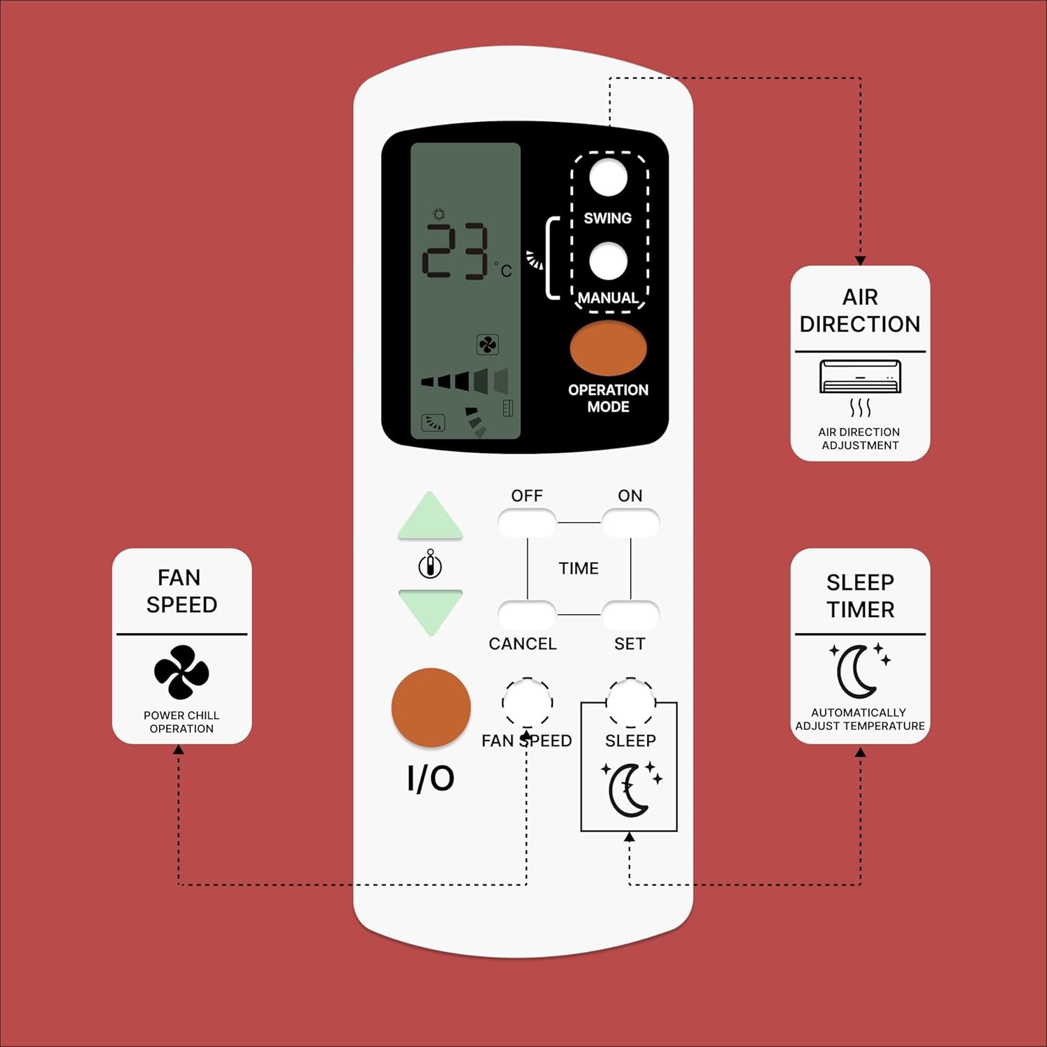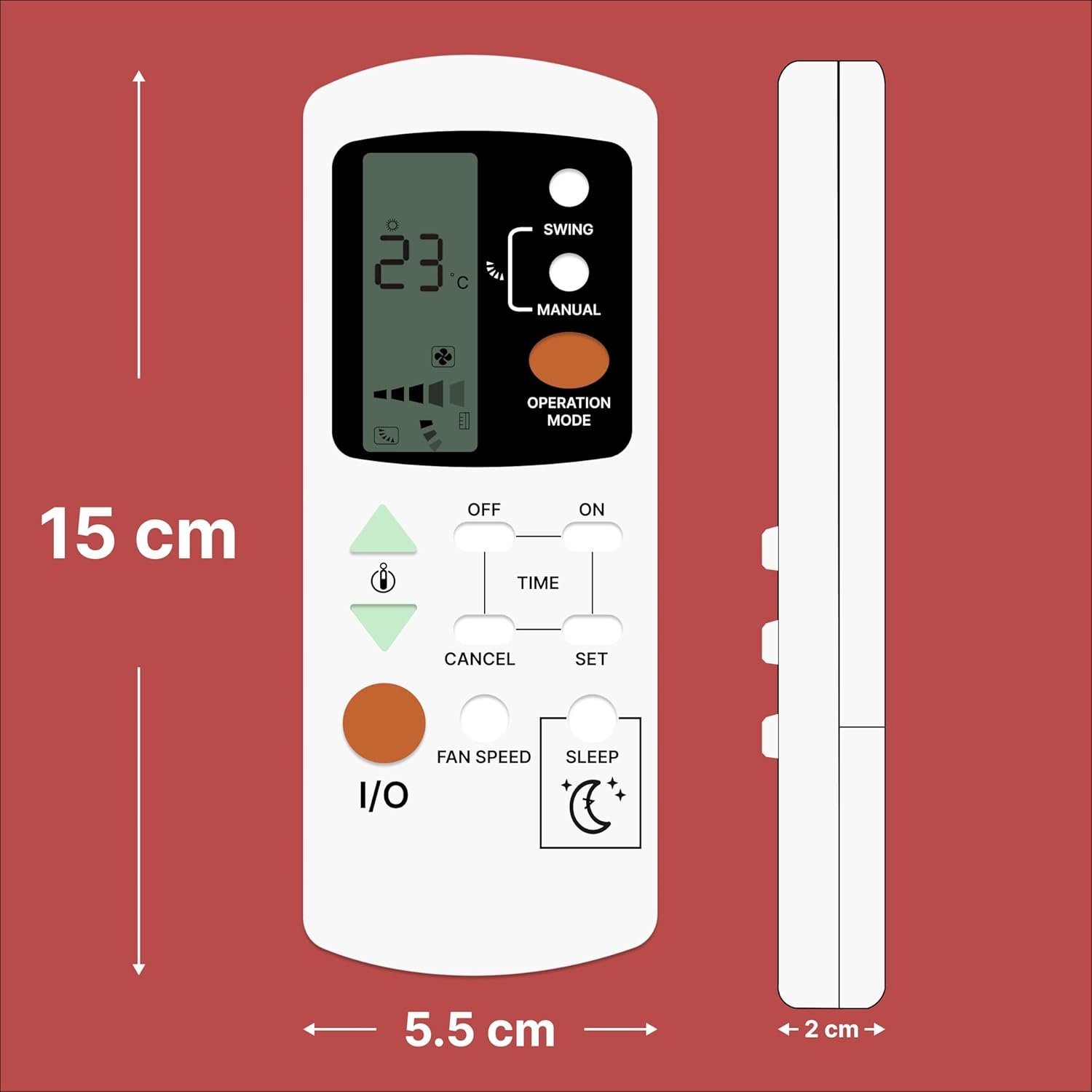 An Air Conditioner (AC) remote control is a compact, handheld device designed for the wireless operation of an air conditioning unit, typically using an infrared (IR) sensor. It features an ergonomic design for easy handling and a user-friendly interface for efficient operation. The remote generally includes several buttons that allow users to customize their cooling or heating experience. The power button turns the AC on or off, while the mode button lets users switch between cooling, heating, fan-only, humidification, and auto modes. Temperature control buttons allow for precise adjustments, such as low, medium, high, and auto, while the swing button adjusts the airflow direction, either fixed or oscillating, for even air distribution. The LCD or LED display screen provides real-time information such as temperature, mode, fan speed, timer settings, and, in some models, even battery levels. Additional high-end features may include a backlit display for better visibility in low-light conditions. Typically powered by AAA batteries, With its combination of intuitive controls, advanced features, and energy-saving options, an AC remote provides convenience and comfort for efficient climate control. Frequently Asked Questions: 1. Batteries Included? Not included. 2. Not Working Properly at first Use? Please do not insert batteries from old remote control. Please make sure you put on brand new batteries while first use. 3. Doesn’t Support? Please make sure your original remote looks back to back like our displayed remote.