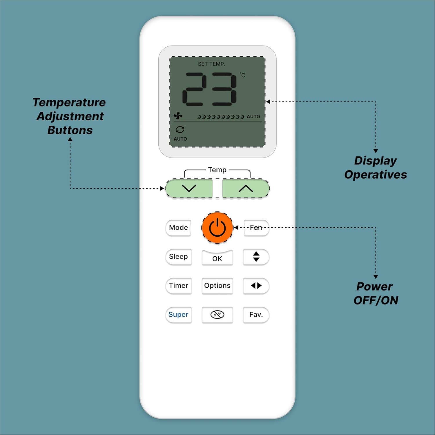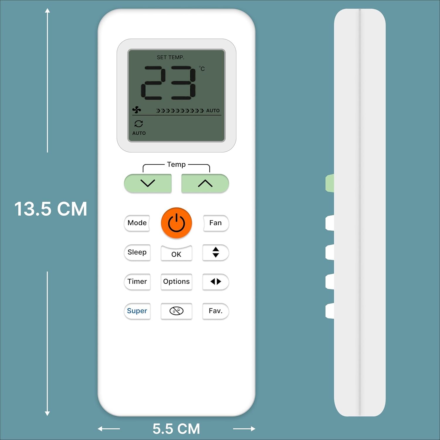 An Air Conditioner (AC) remote control is a compact, handheld device designed for the wireless operation of an air conditioning unit, typically using an infrared (IR) sensor. It features an ergonomic design for easy handling and a user-friendly interface for efficient operation. The remote generally includes several buttons that allow users to customize their cooling or heating experience. The power button turns the AC on or off, while the mode button lets users switch between cooling, heating, fan-only, humidification, and auto modes. Temperature control buttons allow for precise adjustments, such as low, medium, high, and auto, while the swing button adjusts the airflow direction, either fixed or oscillating, for even air distribution. The LCD or LED display screen provides real-time information such as temperature, mode, fan speed, timer settings, and, in some models, even battery levels. Additional high-end features may include a backlit display for better visibility in low-light conditions. Typically powered by AAA batteries, With its combination of intuitive controls, advanced features, and energy-saving options, an AC remote provides convenience and comfort for efficient climate control. Frequently Asked Questions: 1. Batteries Included? Not included. 2. Not Working Properly at first Use? Please do not insert batteries from old remote control. Please make sure you put on brand new batteries while first use. 3. Doesn’t Support? Please make sure your original remote looks back to back like our displayed remote.