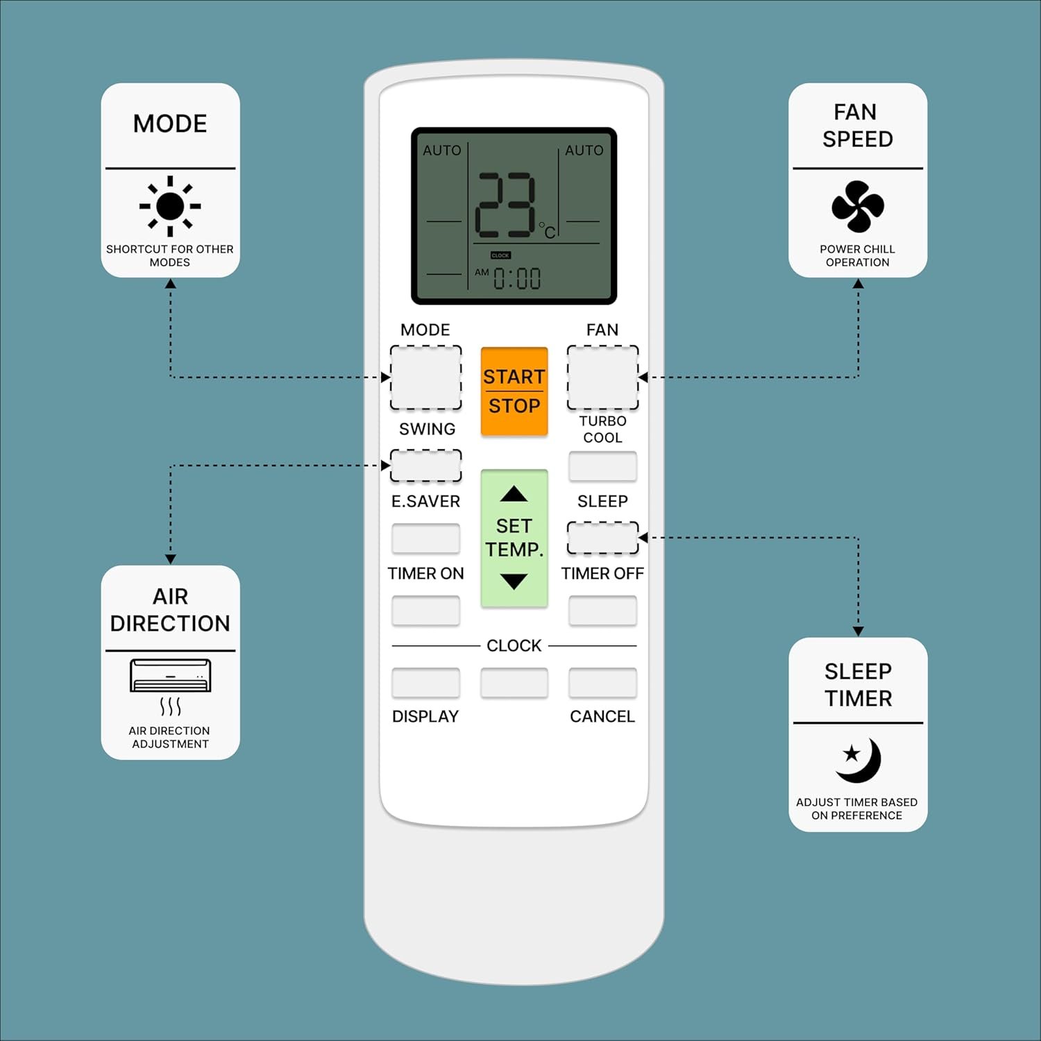 An Air Conditioner (AC) remote control is a compact, handheld device designed for the wireless operation of an air conditioning unit, typically using an infrared (IR) sensor. It features an ergonomic design for easy handling and a user-friendly interface for efficient operation. The remote generally includes several buttons that allow users to customize their cooling or heating experience. The power button turns the AC on or off, while the mode button lets users switch between cooling, heating, fan-only, humidification, and auto modes. Temperature control buttons allow for precise adjustments, such as low, medium, high, and auto, while the swing button adjusts the airflow direction, either fixed or oscillating, for even air distribution. The LCD or LED display screen provides real-time information such as temperature, mode, fan speed, timer settings, and, in some models, even battery levels. Additional high-end features may include a backlit display for better visibility in low-light conditions. Typically powered by AAA batteries, With its combination of intuitive controls, advanced features, and energy-saving options, an AC remote provides convenience and comfort for efficient climate control. Frequently Asked Questions: 1. Batteries Included? Not included. 2. Not Working Properly at first Use? Please do not insert batteries from old remote control. Please make sure you put on brand new batteries while first use. 3. Doesn’t Support? Please make sure your original remote looks back to back like our displayed remote.