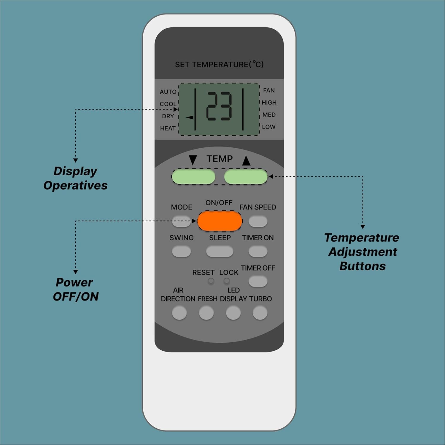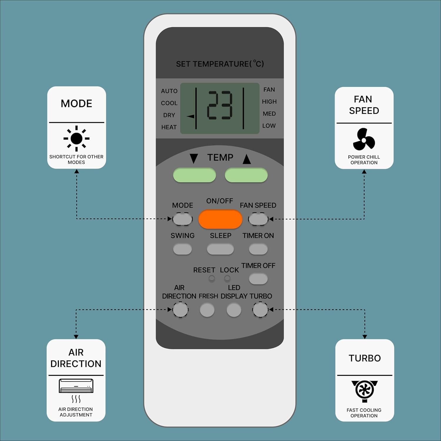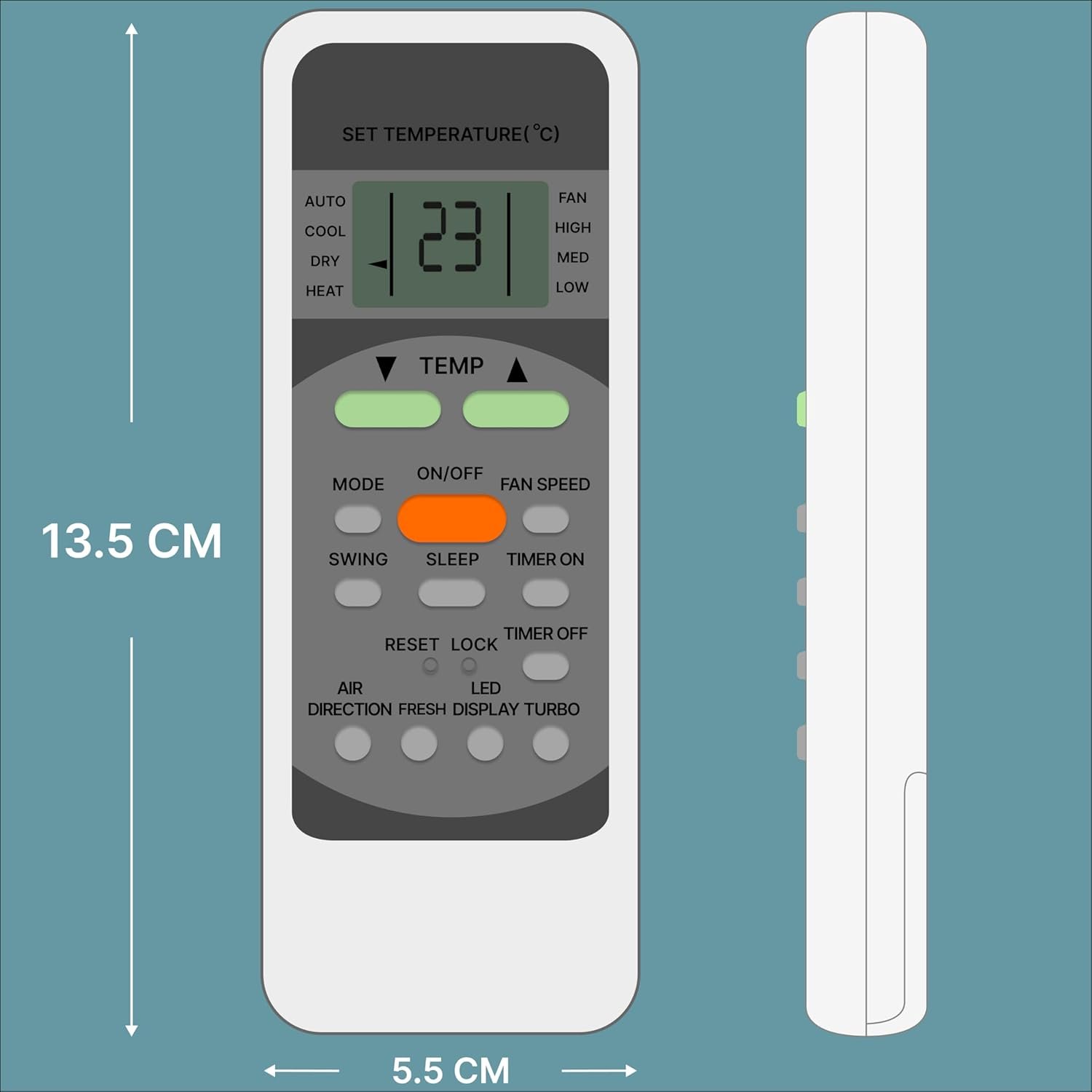 An Air Conditioner (AC) remote control is a compact, handheld device designed for the wireless operation of an air conditioning unit, typically using an infrared (IR) sensor. It features an ergonomic design for easy handling and a user-friendly interface for efficient operation. The remote generally includes several buttons that allow users to customize their cooling or heating experience. The power button turns the AC on or off, while the mode button lets users switch between cooling, heating, fan-only, humidification, and auto modes. Temperature control buttons allow for precise adjustments, such as low, medium, high, and auto, while the swing button adjusts the airflow direction, either fixed or oscillating, for even air distribution. The LCD or LED display screen provides real-time information such as temperature, mode, fan speed, timer settings, and, in some models, even battery levels. Additional high-end features may include a backlit display for better visibility in low-light conditions. Typically powered by AAA batteries, With its combination of intuitive controls, advanced features, and energy-saving options, an AC remote provides convenience and comfort for efficient climate control. Frequently Asked Questions: 1. Batteries Included? Not included. 2. Not Working Properly at first Use? Please do not insert batteries from old remote control. Please make sure you put on brand new batteries while first use. 3. Doesn’t Support? Please make sure your original remote looks back to back like our displayed remote.