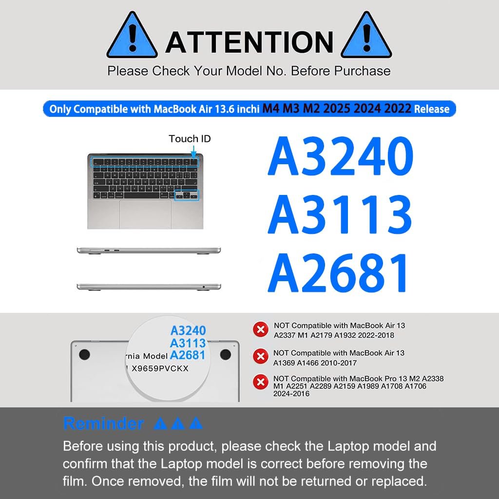 HOW TO VERIFY MACBOOK MODEL: Before purchasing, locate the model number “AXXXX” engraved on your laptop’s bottom case. Ensure your MacBook Air M4 M3 M2 exactly matches one of the listed compatible models: A3240 A3113 A2681.