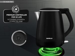 Havells Aqua Plus Electric Kettle 1.2 Litre, 1250 Watt | 304 Stainless Steel Inner Body | Cool Touch Body | Auto Shut-Off |Wider Mouth| 2 Year Warranty (Black)